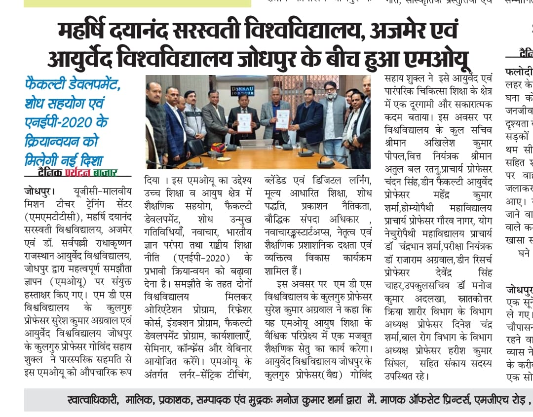 महर्षि दयानंद सरस्वती विश्वविद्यालय, अजमेर व आयुर्वेद विश्वविद्यालय के बीच एमओयू