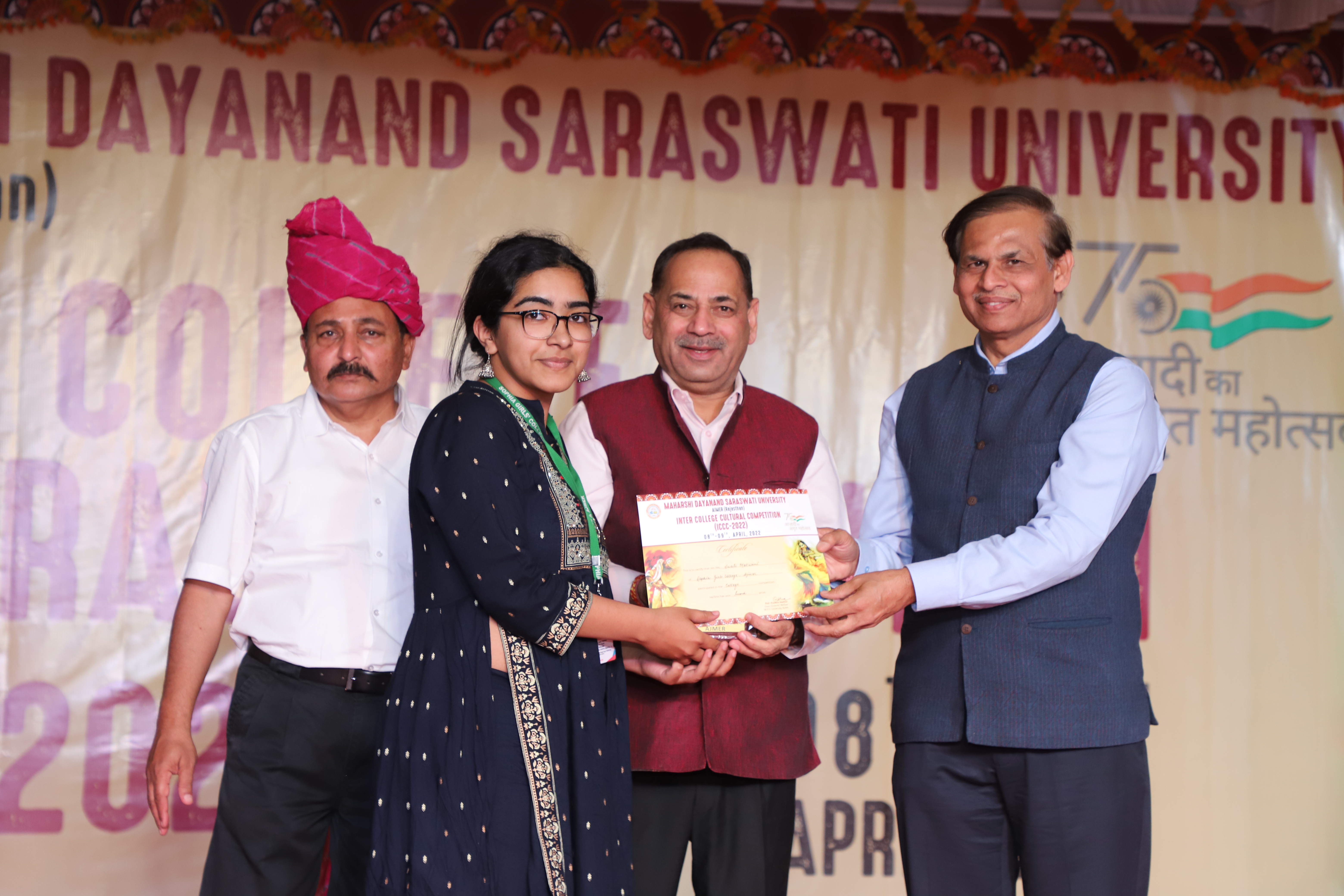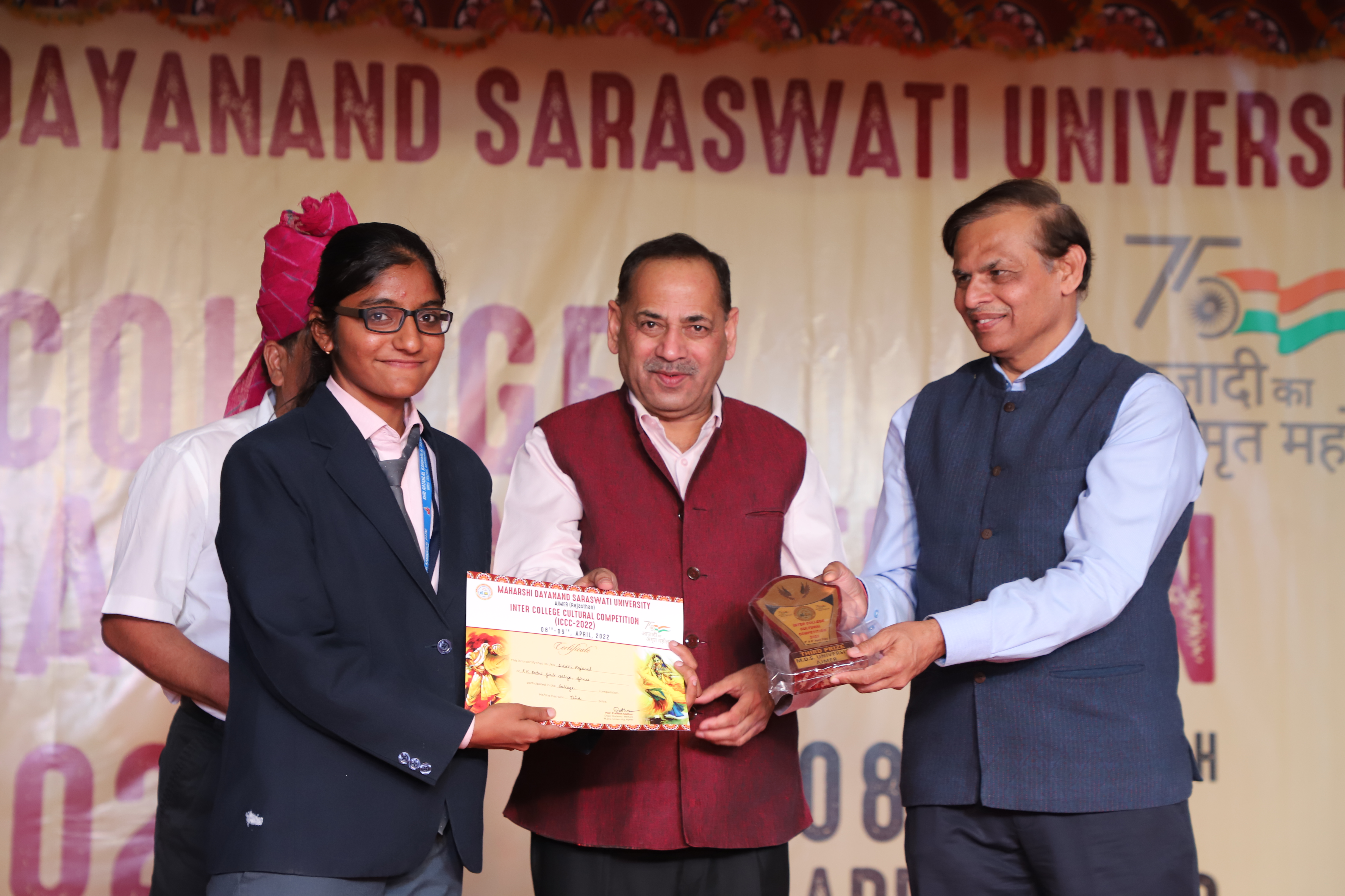 Honorable Vice Chancellor Prof. Anil Kumar Shukla and Chief Guest Prof. Anand Bhalerao Vice Chancellor Central University of Rajasthan ,Ajmer Awarding the winner of Inter - College Cultural Competition
