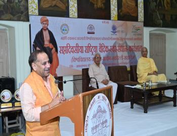 माननीय कुलपति प्रो अनिल कुमार शुक्ला सप्तदिवसिया वैदिक स्वर संधान कार्यशाला में उद्बोधन देते