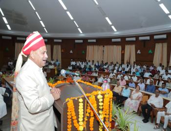 His Excellency Governor and Chancellor Kalraj Mishra, Honorable Higher Education Minister Rajendra Singh Yadav and Honorable Vice Chancellor Prof. Anil Kumar Shukla giving gold medals and degrees to students at the tenth convocation