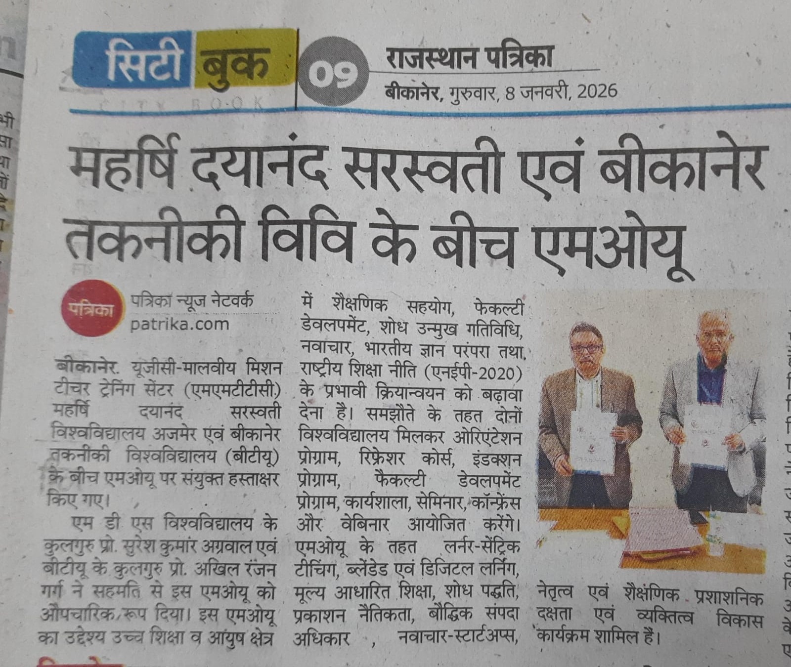 महर्षि दयानंद सरस्वती विश्वविद्यालय, अजमेर व बीकानेर विश्वविद्यालय के बीच एमओयू